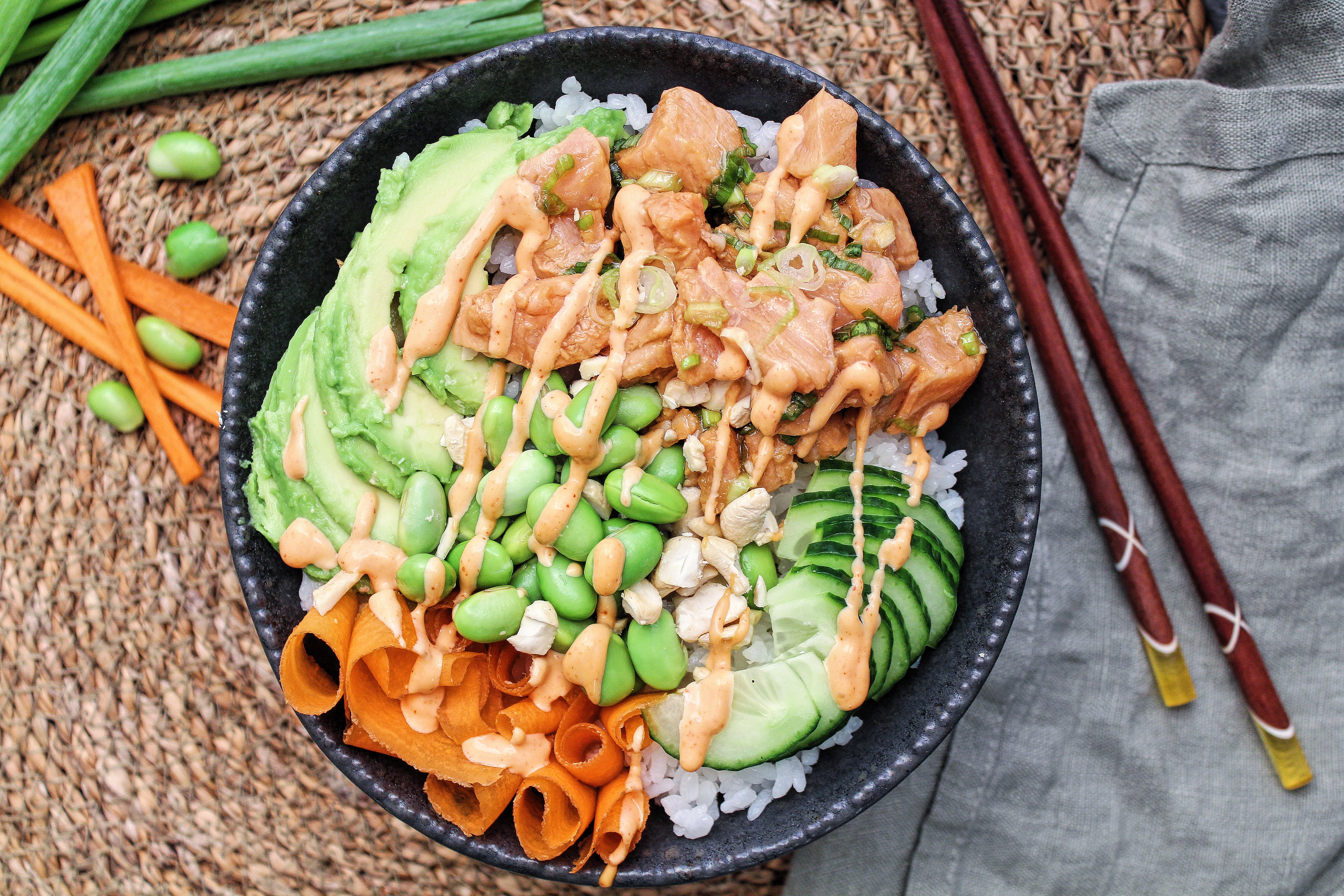 Svona skálar eru mjög vinsælar á mínu heimili þar sem allir fjölskyldumeðlimir geta raðað í sína skál eftir eigin smekk. Ég set hýðishrísgrjón í botninn eða miðjuna og raða svo yfir þau stökkum kjúkling og því grænmeti sem mig langar …