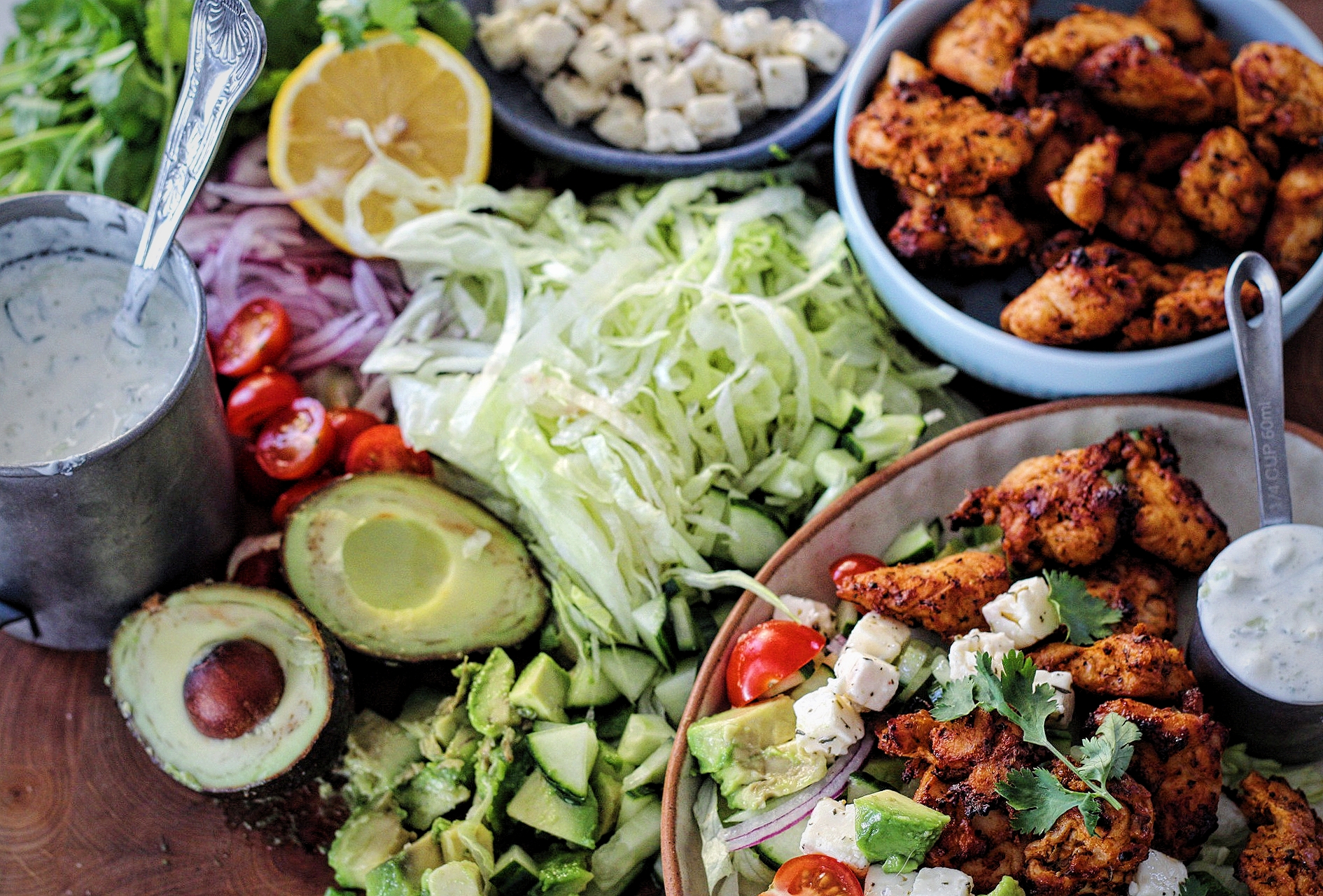 Þetta salat er svo dásamlegt, stútfullt af næringu og það er sérlega þægilegt að getað sleppt einhverjum af innihaldsefnunum eða skipt þeim út. Áherslan er lögð á sem flesta liti og dressingin setur punktinn yfir i-ið. Hún í senn sölt …