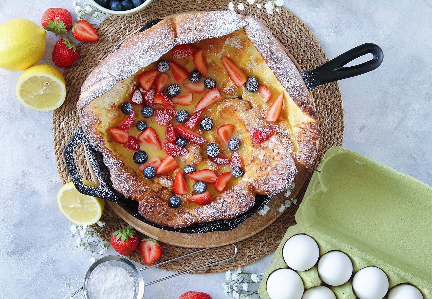 Dutch baby“ pönnukökur eru taldar rekja uppruna sinn til Þýskalands þrátt fyrir að nafnið gefi annað til kynna. Þessar pönnukökur eru alveg sérlega einfaldar og innihaldsefnin eru fá en það er aðferðin við baksturinn sem gerir þær alveg sérstakar og bragðgóðar. Öllum innihaldsefnum er skellt í blandara, þar næst hellt í funheita steypujárnspönnu og beint inn í ofn í korter. Við það lyftist pönnukakan alveg ótrúlega en þegar hún er tekin út úr ofninum fellur hún aðeins saman og við það myndast pláss fyrir mismunandi fyllingar. Hér ber ég hana fram með heimagerðu lemon curd eða sítrónusmjöri eins og það kallast á íslensku. Ég toppa hana síðan með ferskum berjum og dusta smá flórsykri yfir. Sítrónusmjörið geri ég með smá fyrirvara en það þarf að kólna alveg og stífna áður en það er notað, ef ætlunin er að hafa pönnukökuna í bröns væri til dæmis snjallt að útbúa smjörið kvöldið áður.