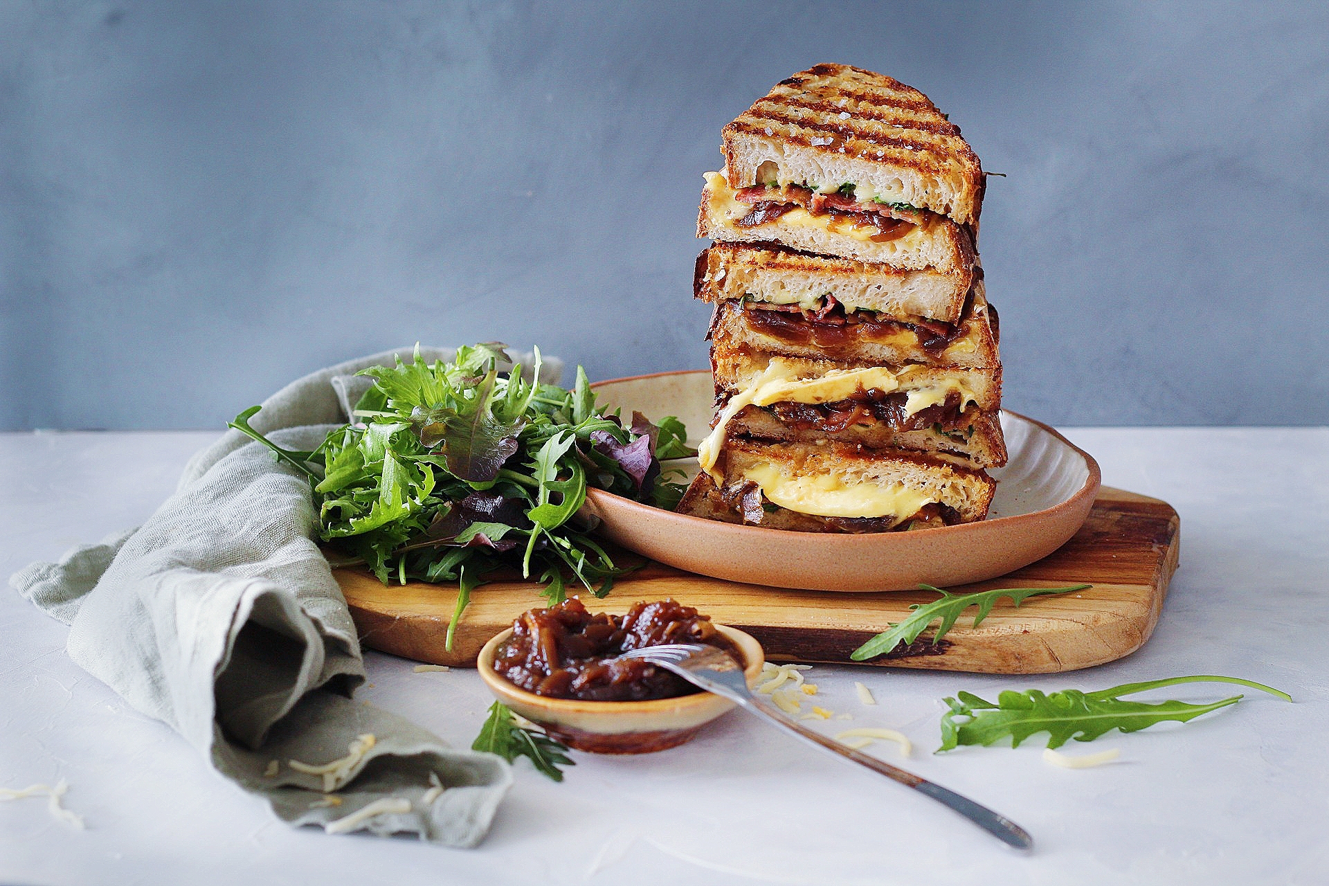 Þessar samlokur eru sannarlega af betri gerðinni. Smávegis lúxus en samt svo einfaldar og fljótlegar. Á milli tveggja glænýrra sneiða af súrdeigsbrauði koma vænar sneiðar af brie osti, stökkt beikon, rifinn ostur, klettasalat og punkturinn yfir i-ið er sultaður balsamik laukur sem fullkomnar bragðið. Grillaðar í blússheitu samlokugrilli og bornar fram með fersku salati. Þær passa ótrúlega vel sem hádegisverður, léttur kvöldverður eða jafnvel á bröns bakka og þá jafnvel skornar í fleiri bita.