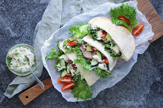 Skerið það magn af grænmeti sem ykkur hugnast og raðið á disk. Hitið brauðin og skerið í tvennt. Smyrjið þau að innan með sósunni, stráið cheddar osti inn í og raðið salatblöðum í brauðin. Setjið kjöt og grænmeti eftir smekk ofan á salatið og toppið með fetasósunni.