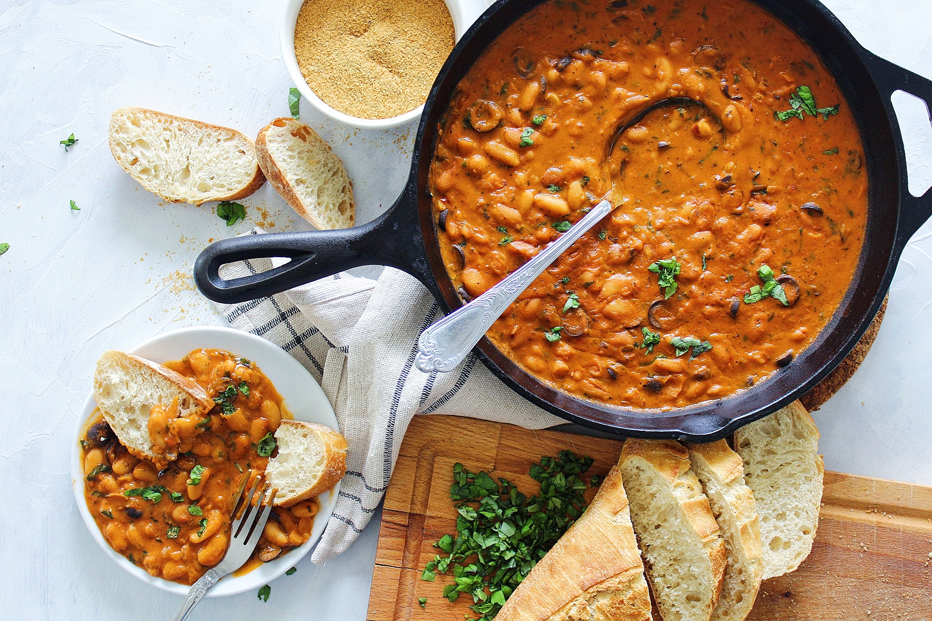 Með baununum í réttinum eru meðal annars ítölsk krydd, hvítlauk, svartar ólífur, næringarger og kókosmjólk. Samsetning sem er algerlega ómótstæðileg með nýbökuðu ciabatta eða súrdeigs brauði.