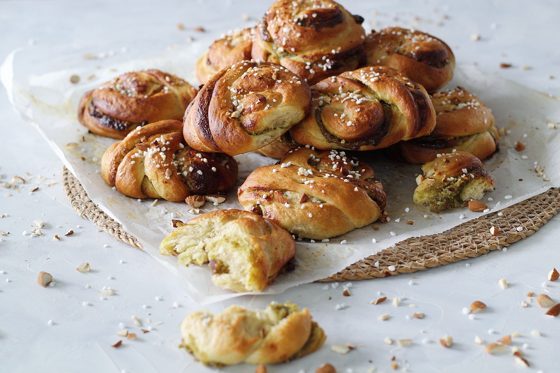 Þessir hnútar eru algjörlega dásamlegir, stökkir að utan, mjúkir að innan með pistasíukremi, marsípani og möndlum. Þeir minna í senn á sænskt bakkelsi og eitthvað stórkostlegt úr bakaríi. Þeir eru í raun og veru mjög einfaldir en það er aðeins hefunartíminn sem gerir það að verkum að það tekur smá stund að gera þá. Pistasíusmjörið fékk ég fyrir nokkru í Costco en það má setja hvað sem er á milli, súkkulaðismjör, eða smjör og kanilsykur, það má skipta út möndlunum fyrir aðra tegund af hnetum eða sleppa þeim jafnvel alveg. Þessi uppskrift er að mestu vegan en ef pistasíukreminu er skipt út fyrir vegan smyrju eru þeir 100% án dýraafurða.