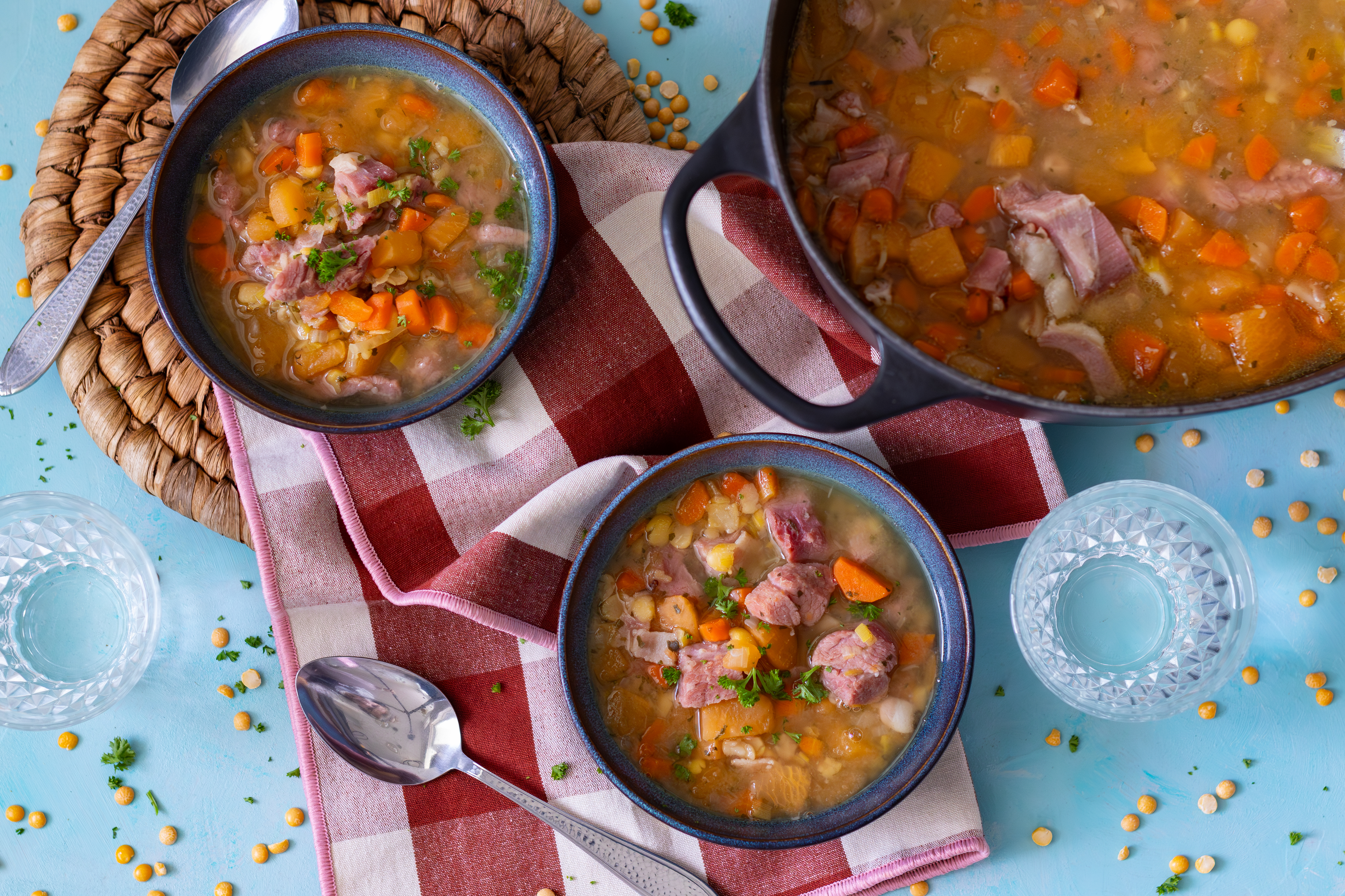 - Setjið baunirnar í sigti og skolið vel með köldu vatni. Setjið þær í stóran pott og hellið vatninu út í ásamt grænmetis- og lambatening. Hleypið upp suðu og fleytið froðunni af. Látið baunirnar sjóða í 35-40 mín. Ef baunirnar hafa ekki verið látnar í bleyti er passlegt að sjóða þær tvisvar sinnum lengur. Á meðan baunirnar sjóða er gott að undirbúa kjötið og grænmetið.
