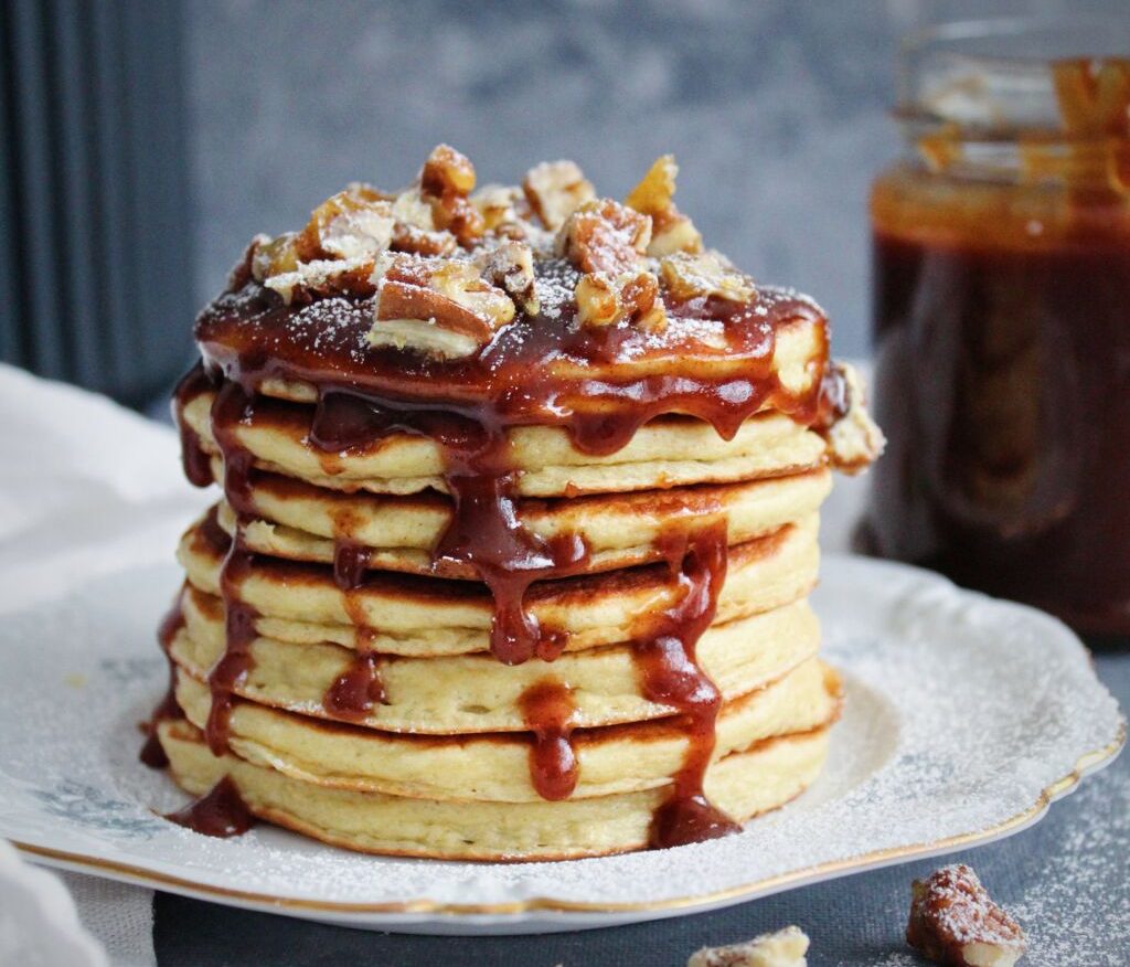 Þessar pönnukökur eru tilvaldar í jólabrönsinn eða jólaboðið. Karamellan er eins og fljótandi piparkökur og stökkar pekanhneturnar setja punktinn yfir i-ið.
