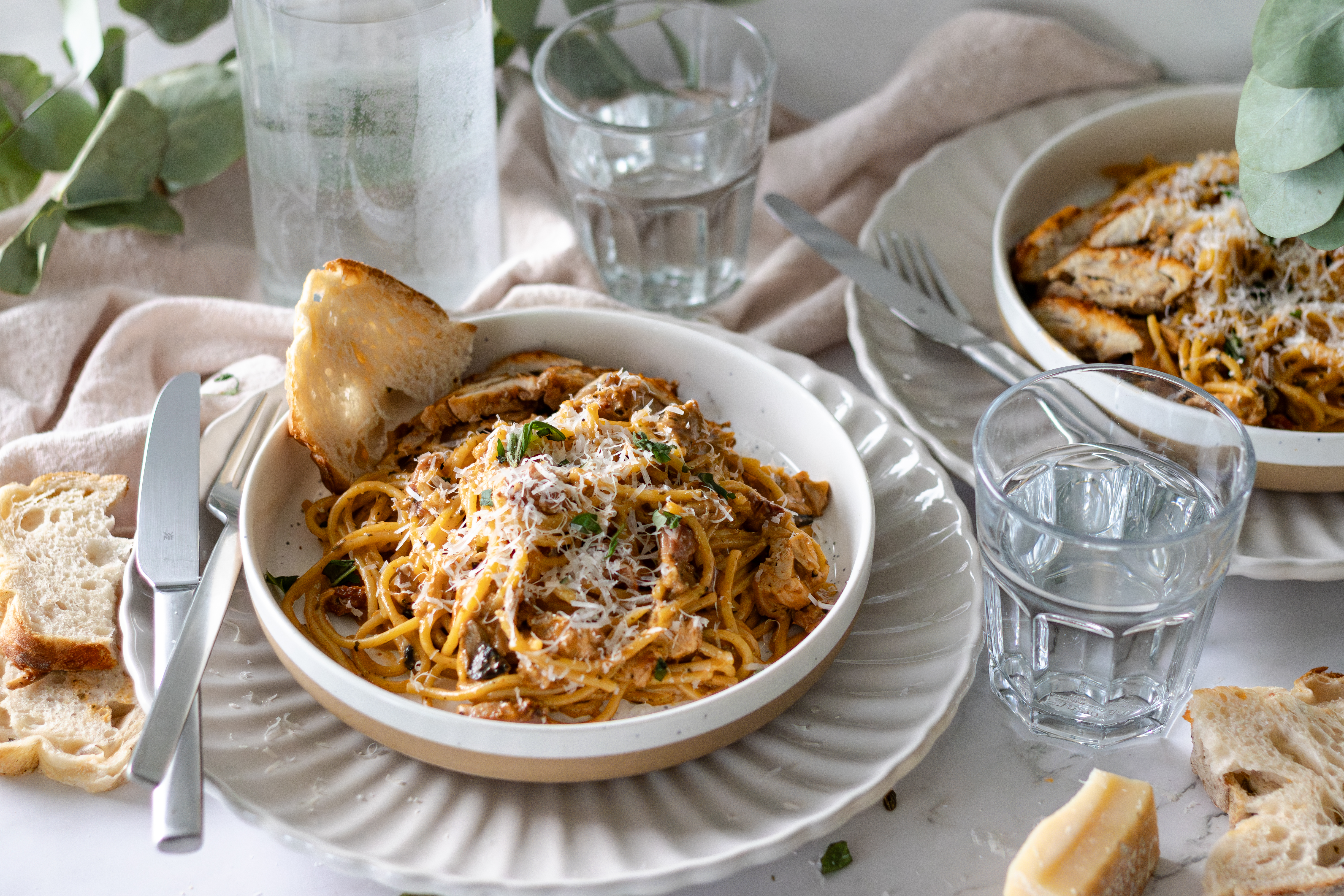 Minn uppáhalds pastaréttur í glútenlausri útgáfu. Rjómalöguð pestósósa með beikoni, djúsí kjúklingi, sveppum og nóg af parmesan!