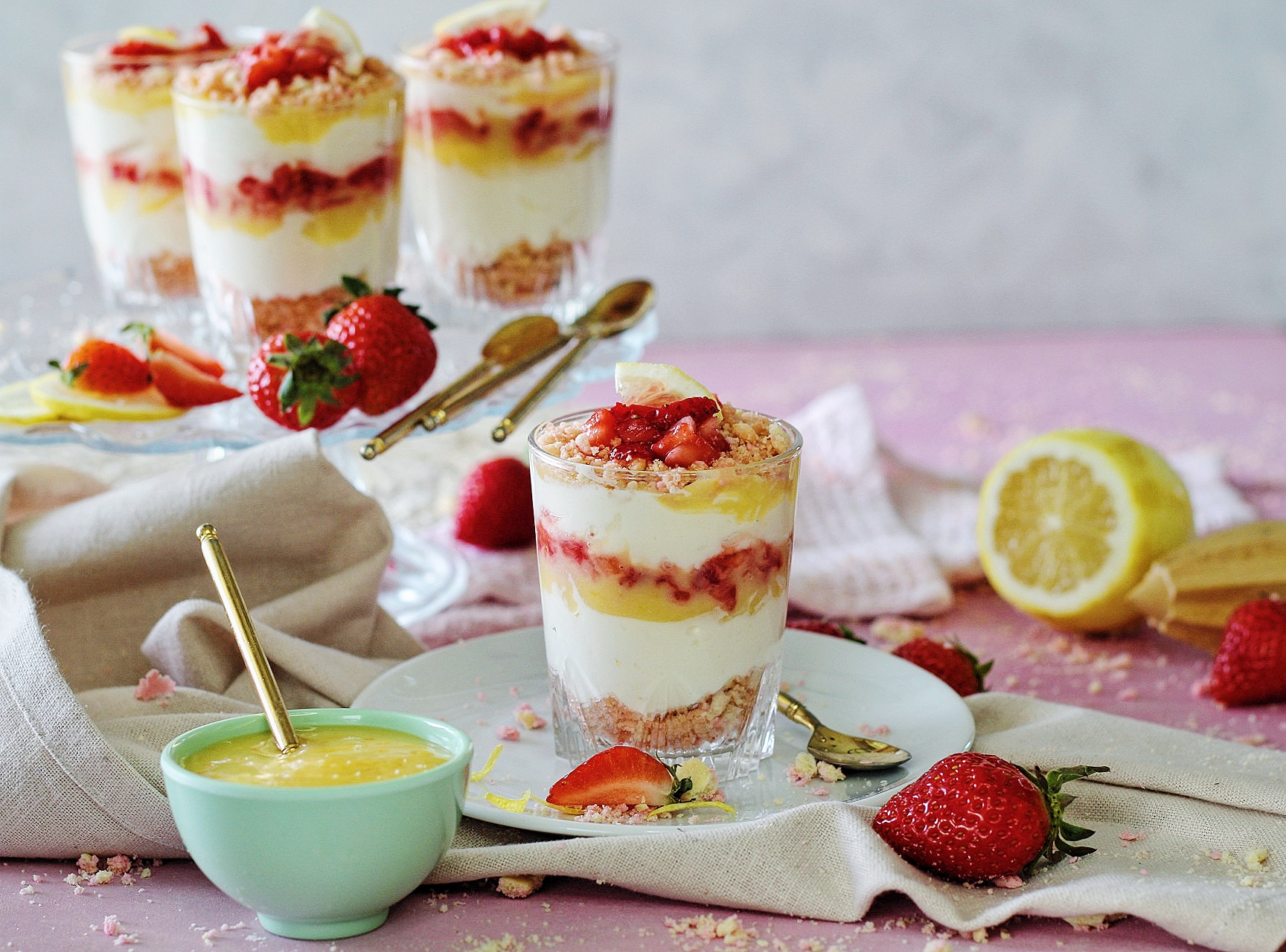 Litlar sítrónuostakökur í glösum með jarðarberjakremkexi, heimagerðu lemon curd og ferskum jarðarberjum. Fullkominn sumar eftirréttur!