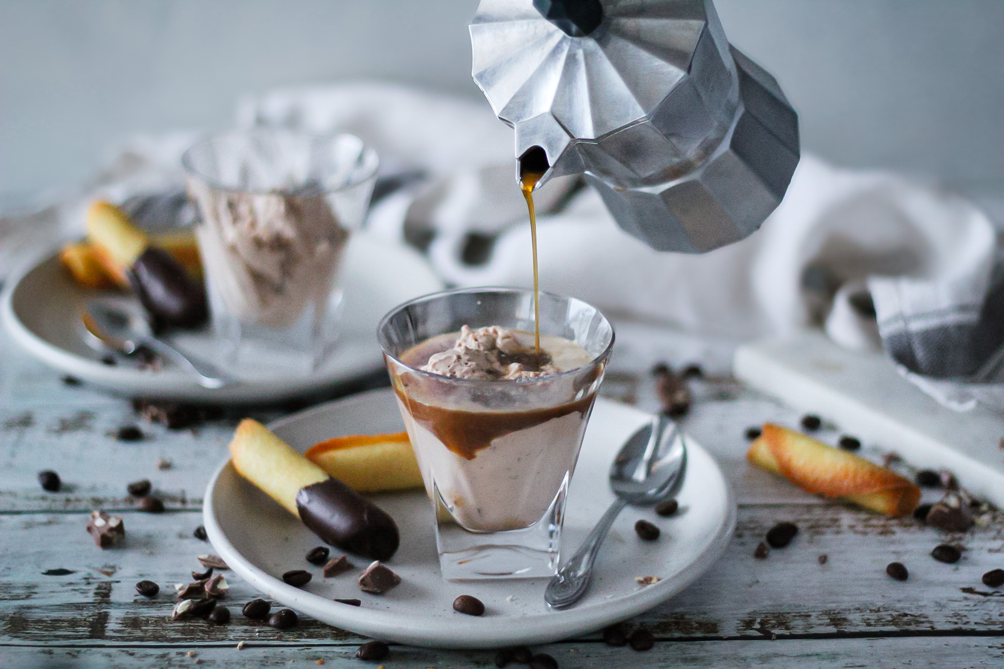 Mjúkur heimagerður súkkulaðiís með krókant súkkulaði sem drekkt er í lífrænu espresso kaffi og borinn fram með heimagerðu ískexi. Ólýsanlega góður eftirréttur!