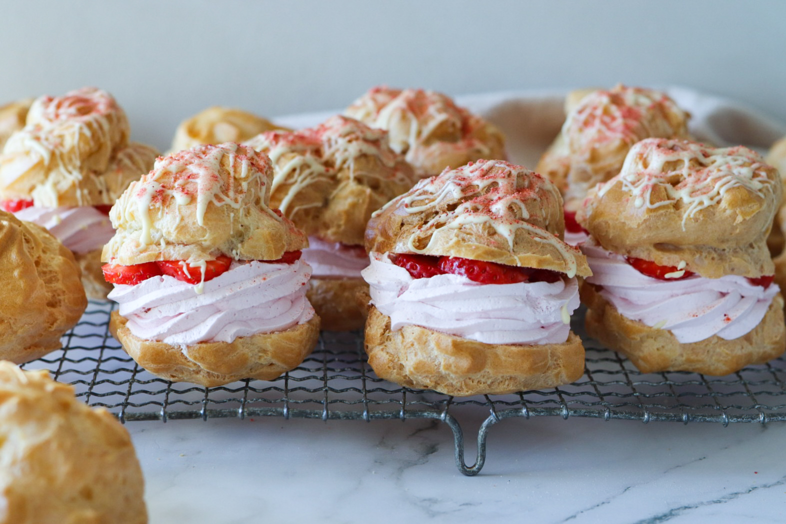 Ég stenst sjaldan eitthvað með jarðarberjum svo ég ákvað að fara alla leið í ár og hafa hana jarðarberja út í gegn. Ég fyllti þær með jarðarberjafrómas, jarðarberjasultu og ferskum jarðarberjum. Ég dreyfði svo bræddu hvítu súkkulaði yfir og dustaði frostþurrkuðum jarðarberjum yfir súkkulaðið. Algjör jarðarberjabomba!